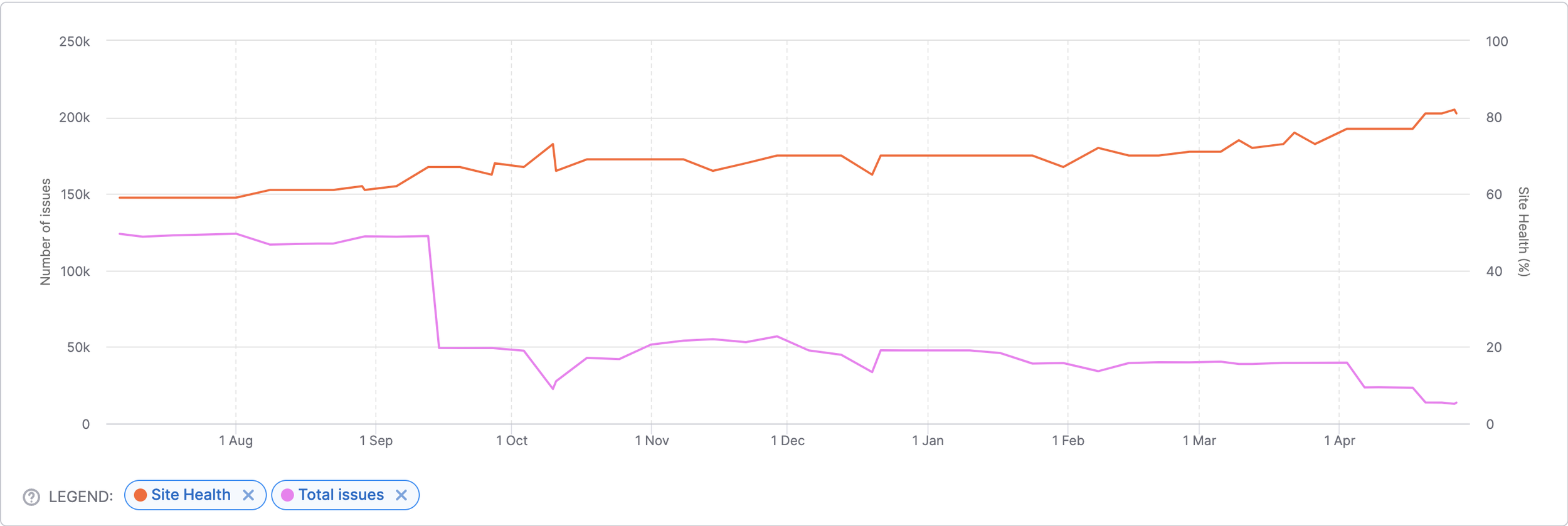 The website’s Site SEMrush Health Score escalated from 53% to 82%, indicating a robust improvement in website functionality and SEO health. This puts it ahead of the industry standard of 77%.